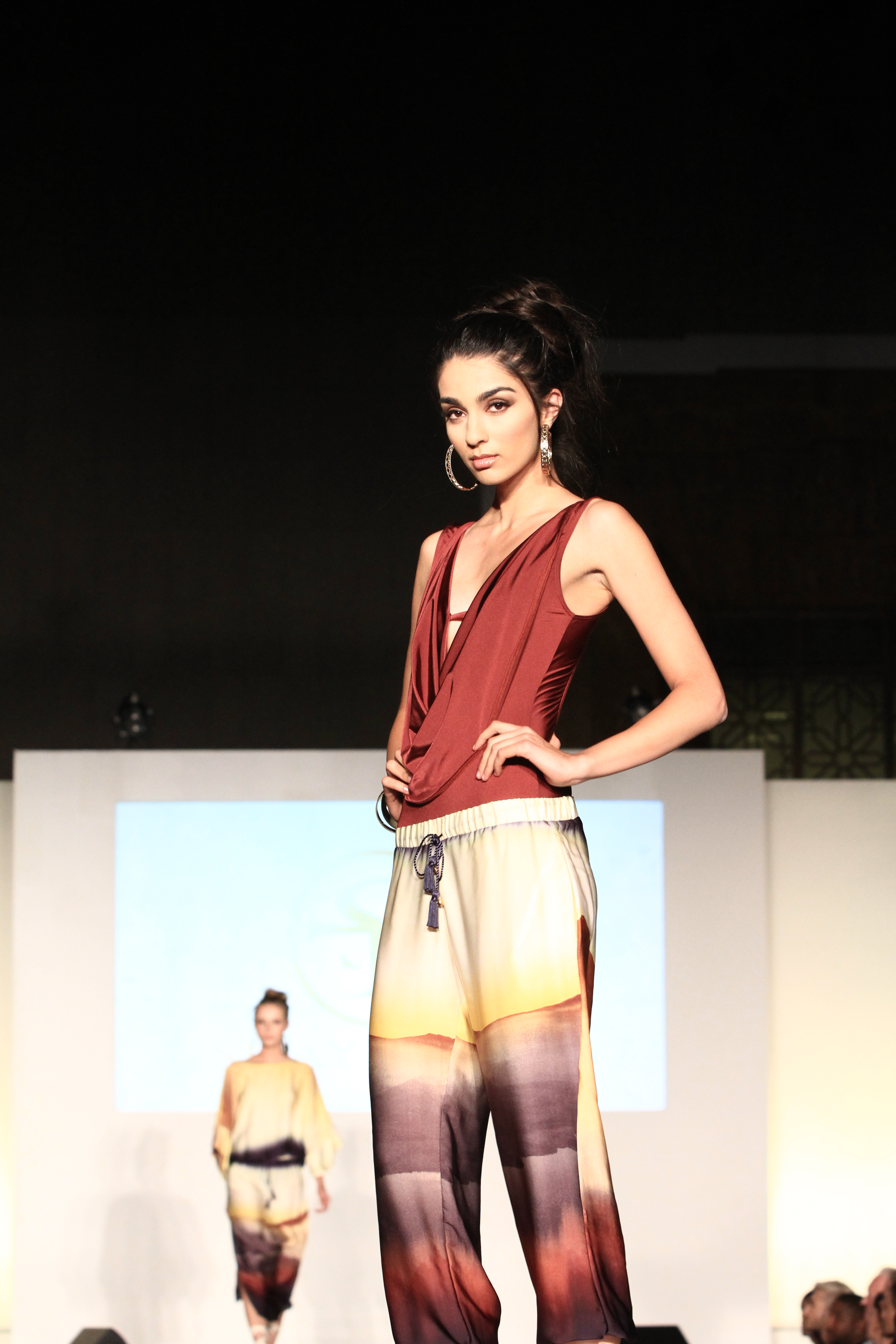 Johnny Was showcased fun prints, elegant silks, bright colors, and a flirty style. My favorite dress of the whole event is pictured above. Nameless USA displayed many shiny silks and satins, fun prints with cats and zippers, as well as studs. Models came out in elegant dresses and short booty shorts. Jet Age reminded me of travel agent style mixed with a retro 50’s look with their Good Year jackets, varsity jackets, sporty sexy boy attire, and powerful patches on the shirts and jackets. Liberty Sage showcased elegant mommy looking dresses, some very simple and tailored. My favorite ensembles were white shorts with a bold black and white jacket and peachy coral colored dresses. Quynh Paris seemed very Vietnamese inspired with their long flowing dresses some with sheaths to the floor and elaborate cut outs. The glitzy chic almost seemed like tacky prom attire. They made brash statements with see-through and sheer pieces and fish netting gauze wraps all the way to the floor. Some models came out with floppy hats made of hanging fabric – tres haute couture!
