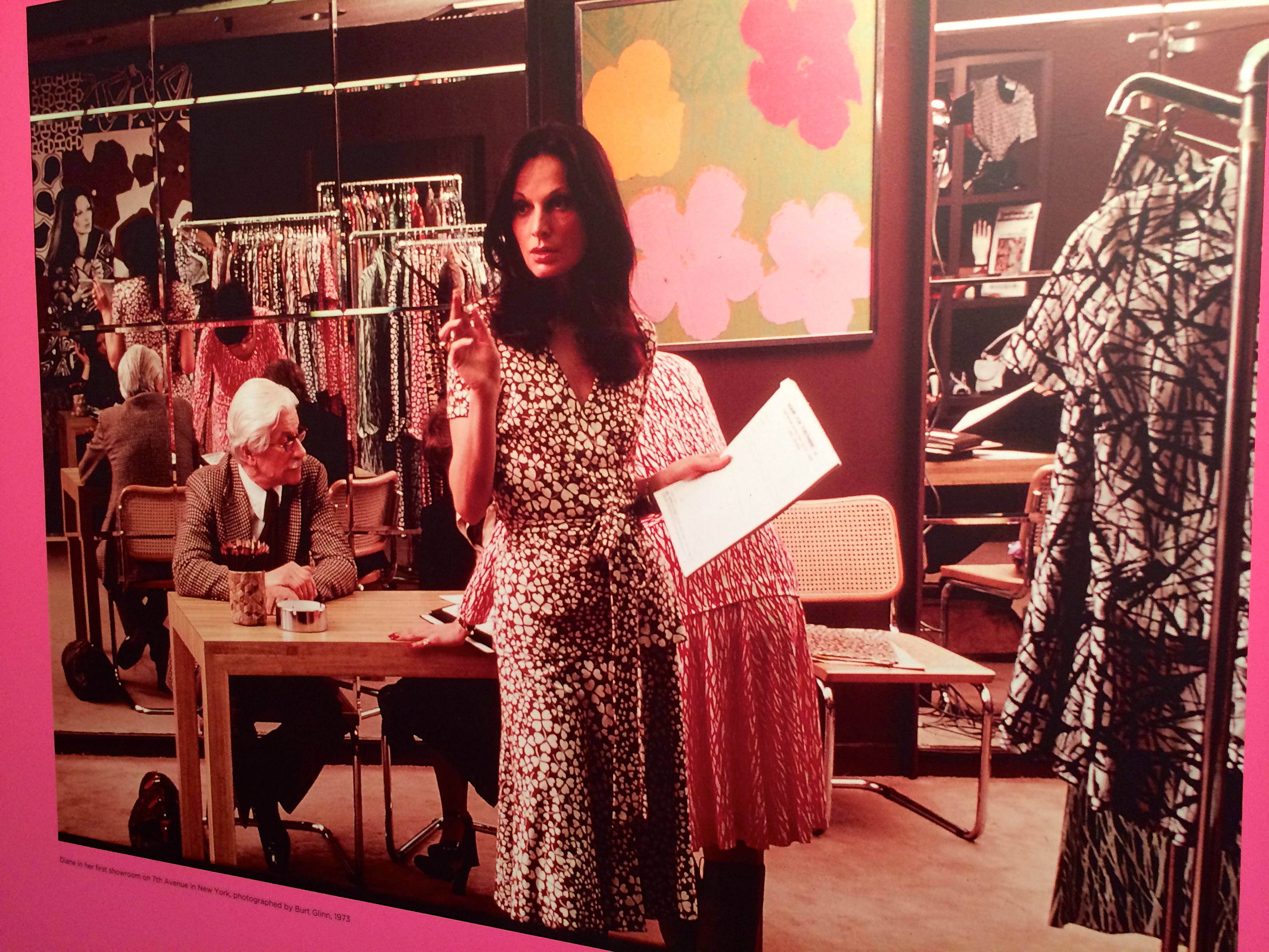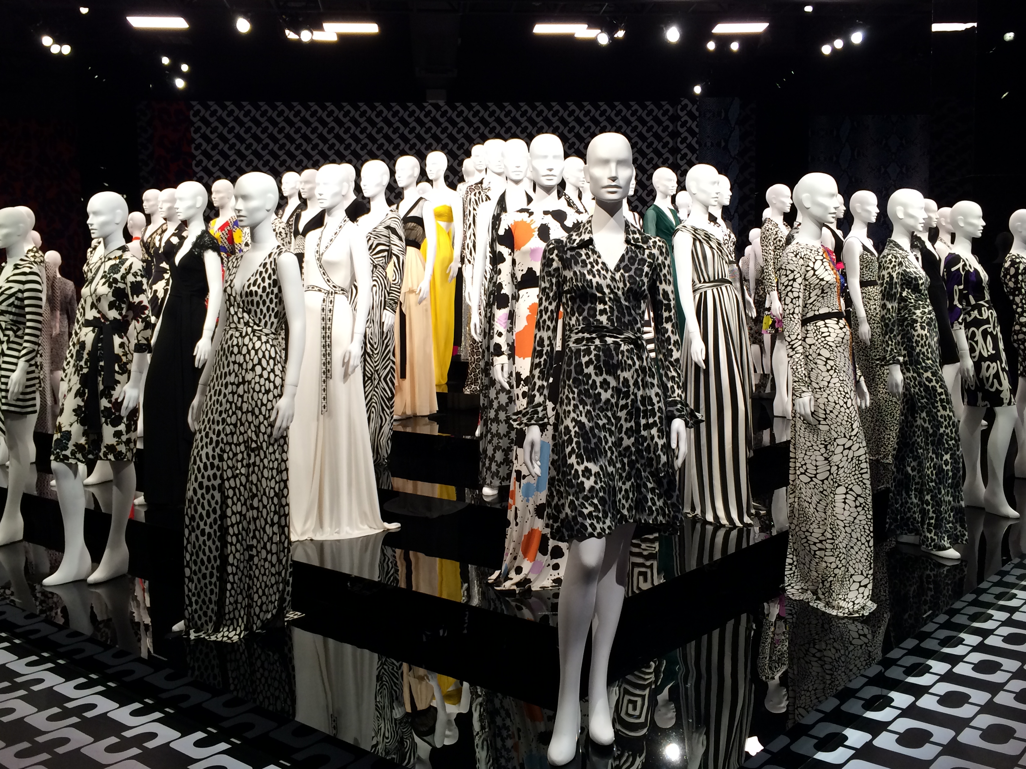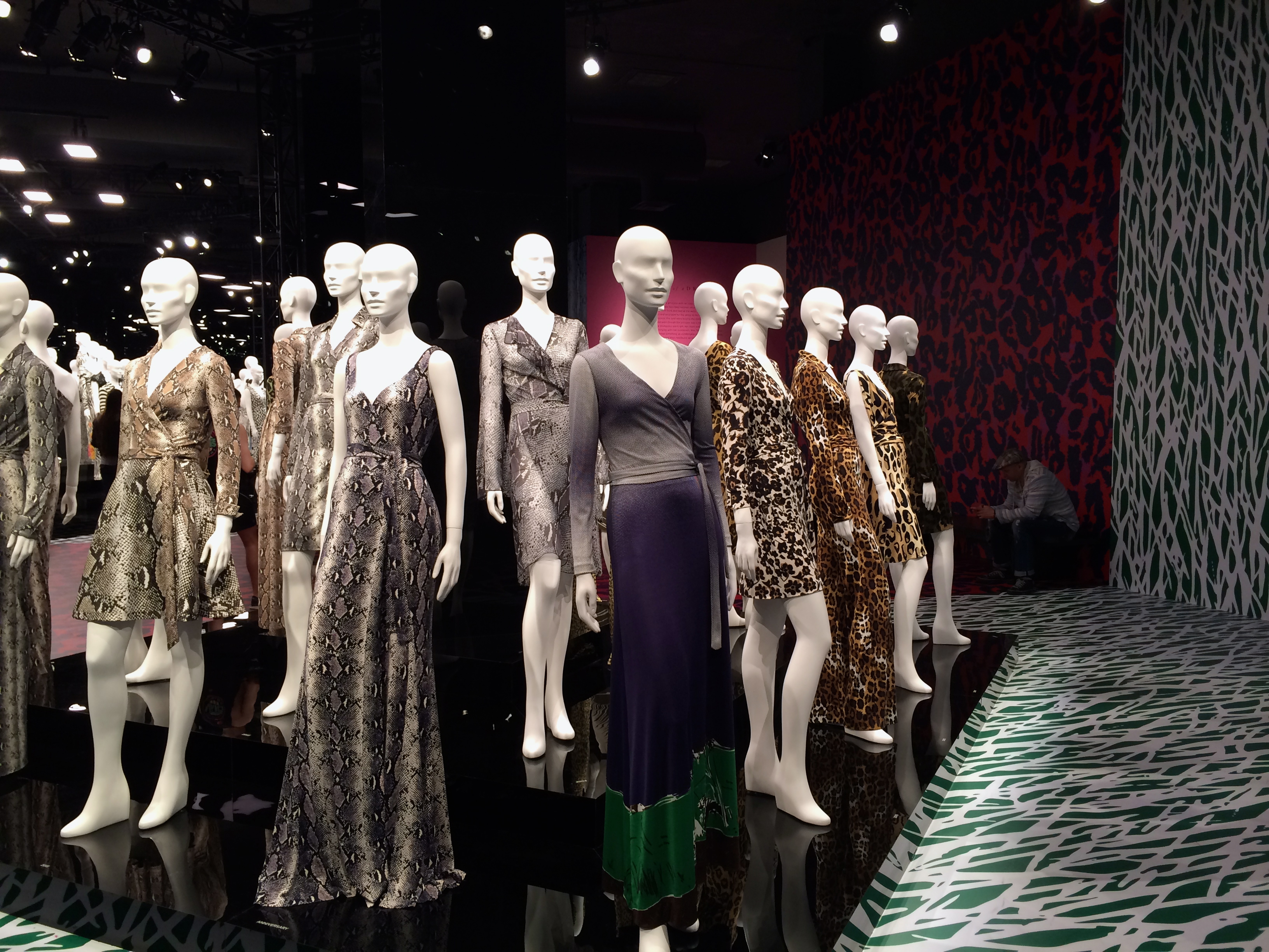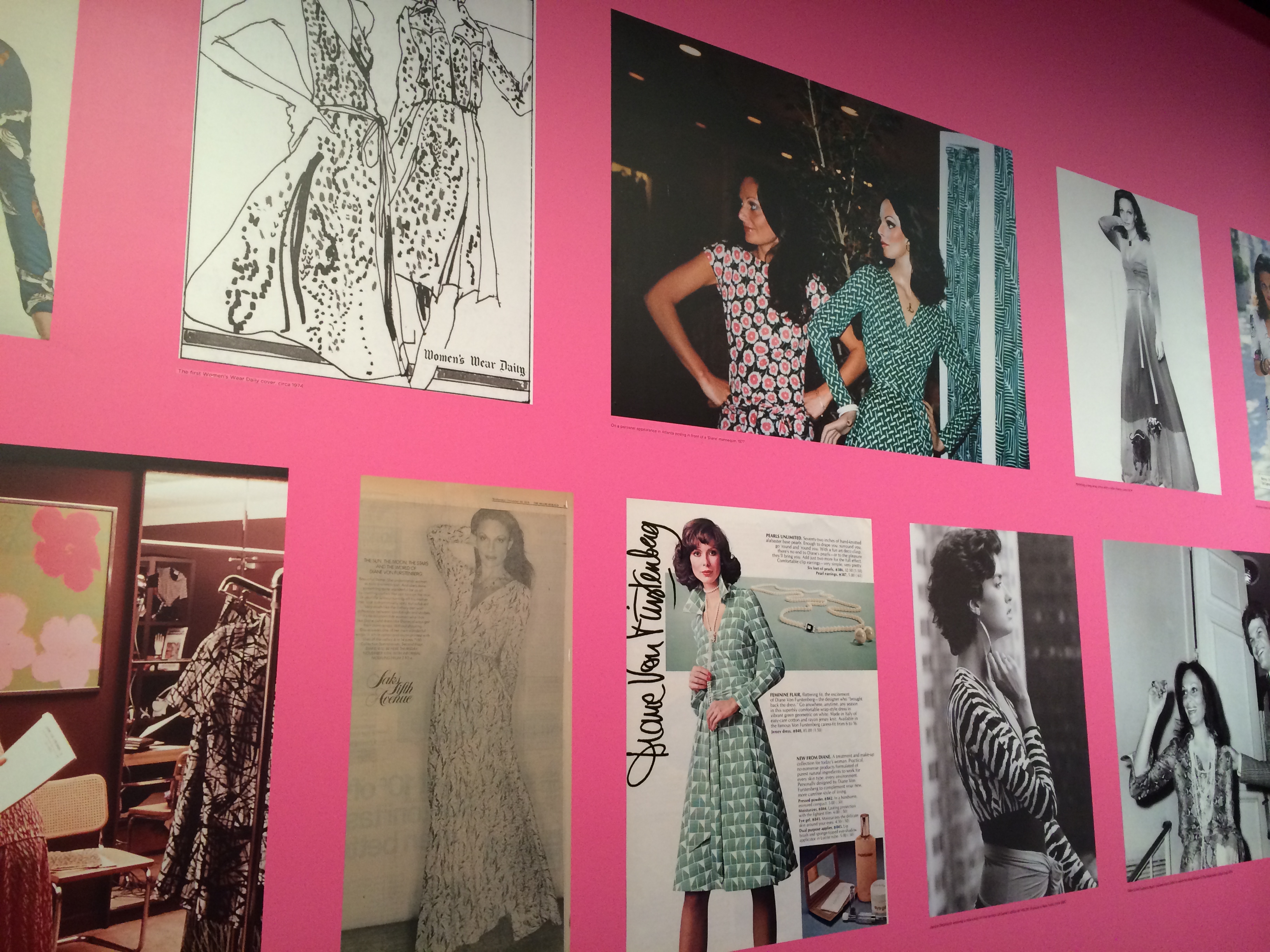 As I entered the new exhibit at LACMA honoring fashion designer Diane vonFurstenberg (formally a princess), I strolled down a long haul filled with large sized images of her iconic wrap dress, many on the cover of magazines like Vogue and Newsweek. Images of Cheryl Tiegs, Madonna, Paris and Niki Hilton clothed in her wrap dress with von Furstenberg’s name as the print brought me back to a long forgotten time. The memorable 1970’s and 1980’s prints here and there – pink cheetah, green and white zig zagging patterns, black and white popping prints. The walls and floors hugged us with those same designs reminding us of the women we idolized in the fashion magazines.