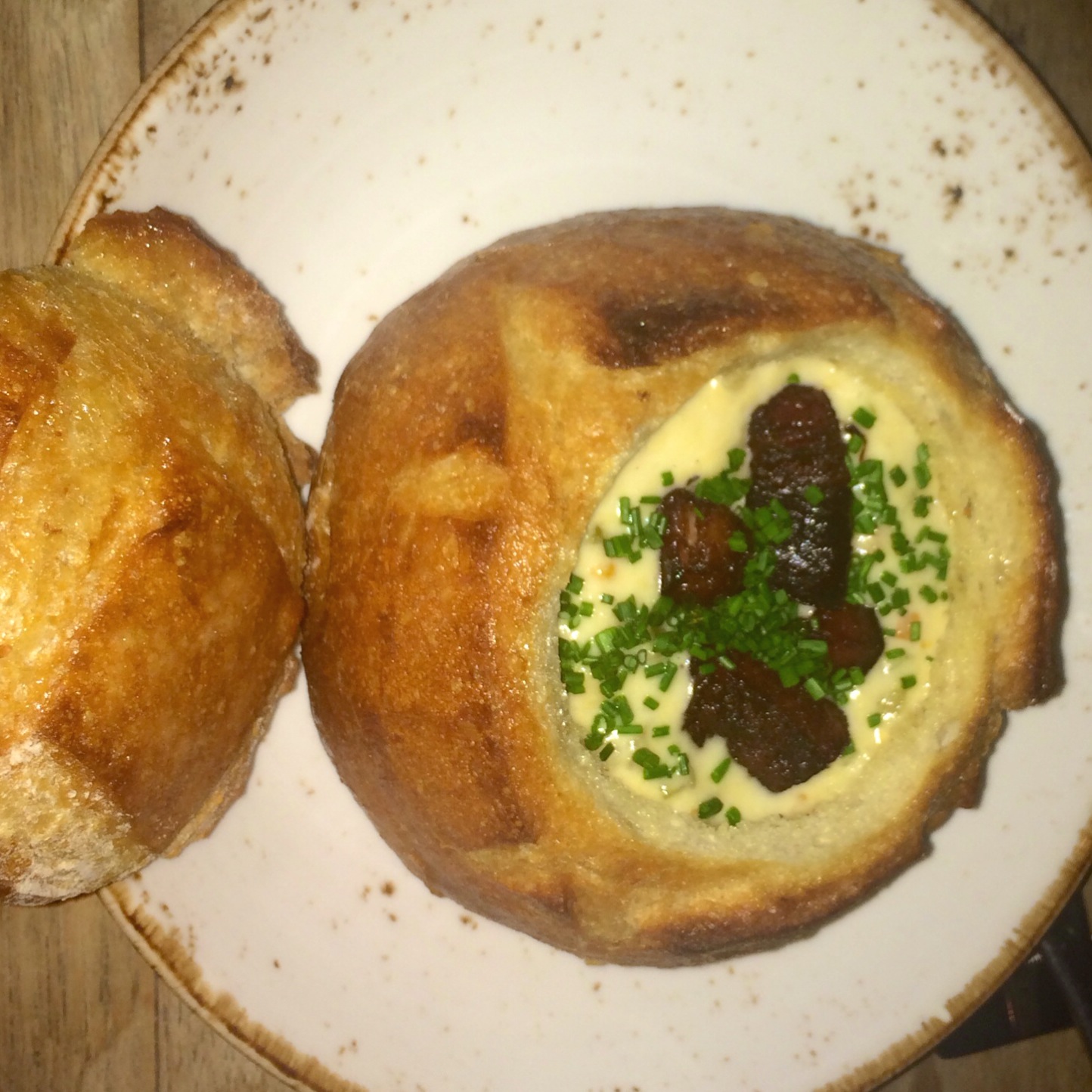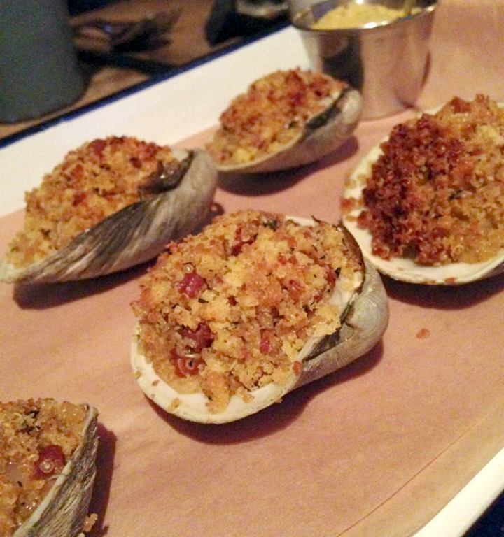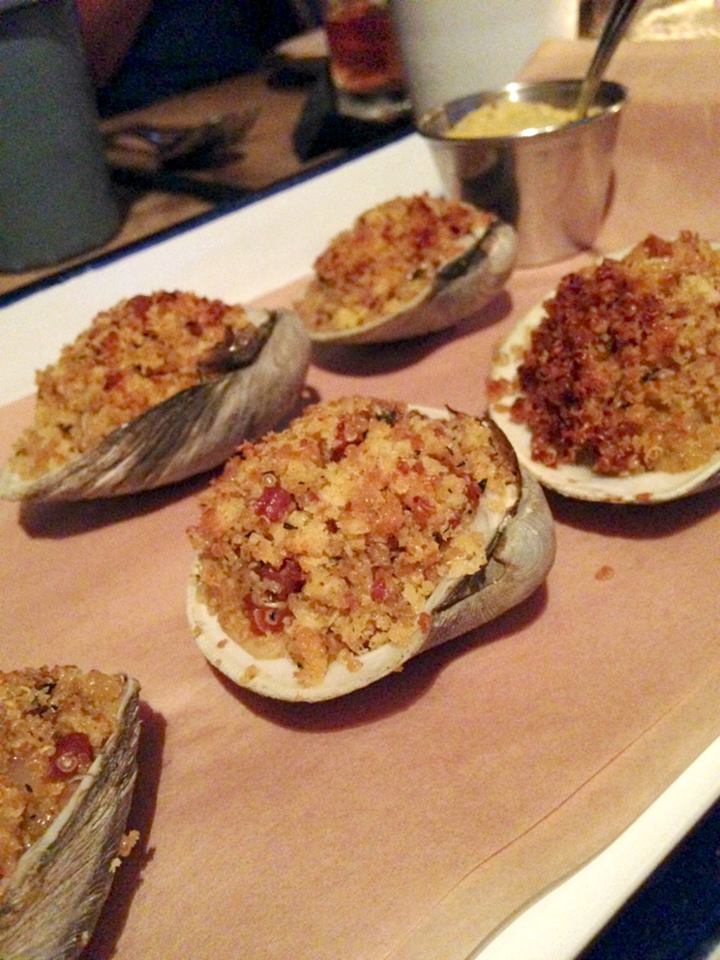 At dinner we had: 1) raw oysters with habanero chutney, cocktail sauce, and traditional mignette with home cooked mini biscuits, 2) scallop crudo with kimchi juice and crunchy amaranth seed, 3) stuffed clams casino with quinoa prosciutto and spicy tartar sauce, 4) the best effing clam chowder ever (my name for it, not theirs) in a bread bowl with braised pancetta, 5) pan seared rock cod in chili oil, 6) porterhouse pork chop double cut in shallot cream sauce with carrots and yogurt, and on my goodness, a twice baked lobster baked potato.