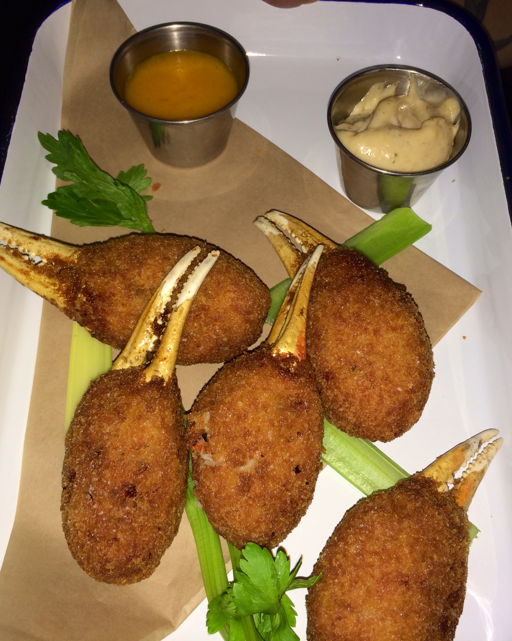 For starters we were treated to: 1) chicken skin chips (think pork rinds) with cornichon and egg salad, 2) crab pops with a snow crab claw coated in a blue crab/Dungeness crab croquetas style breading to be dipped in habanero chutney. Awesome. Each was balanced with fat, the right amount of acid, and a hit of familiar flavors combined to create a new appetizer experience.