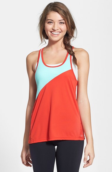 Their best-selling Sabrina silky tank is also one of my favs because it is super cute and lightweight. When I am spinning and sweating, it lets me breathe. The fashionable tank is perfect for running or a circuit style class. The bold color combinations with their updated silhouette makes me think of classic long-distance running gear. So digging my red mint look!