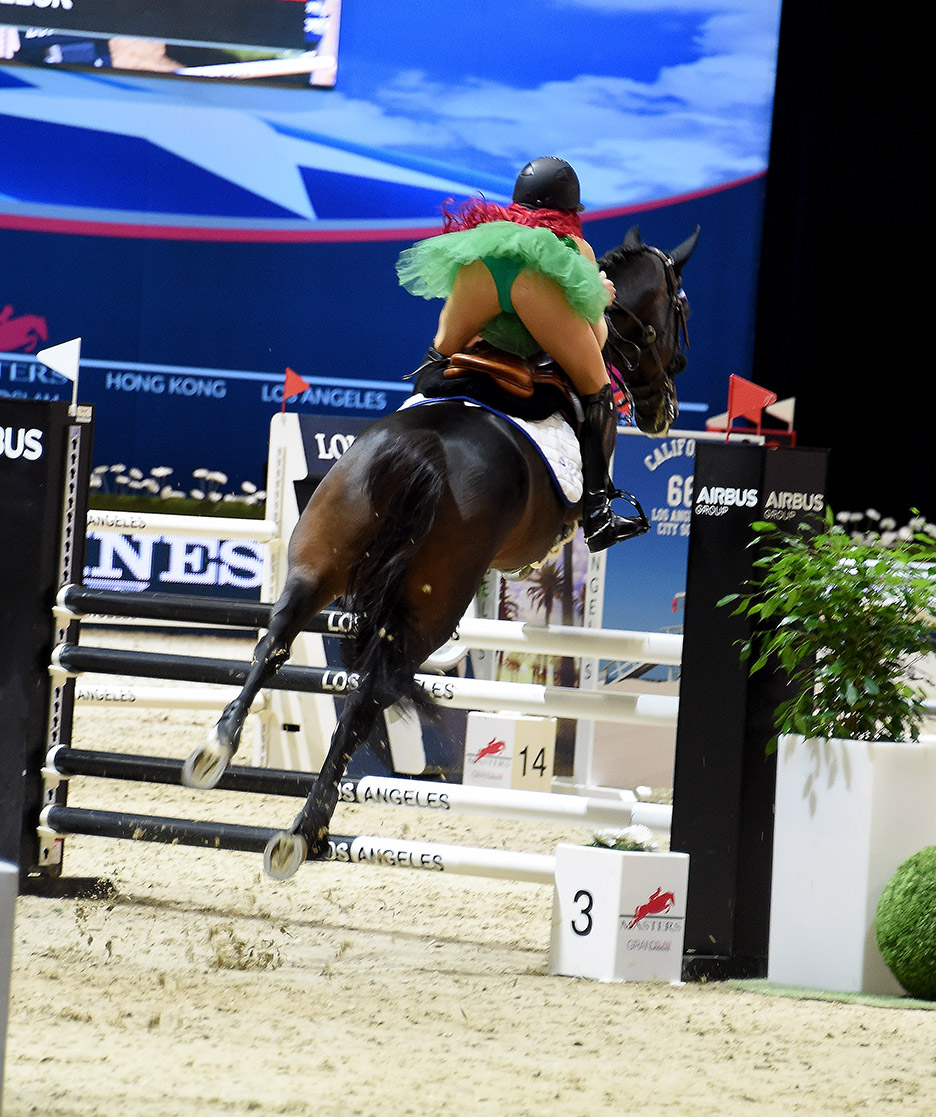 Where else can you go and see a green tutu and red wig going around a jumping arena course? None other than the Saturday night Charity Pro-Am Style and Competition. Riders such as Kaley Cuoco, model Gigi Hadid and Hannah Selleck, Tom’s daughter, took on a tough course in themed costumes for charity.
