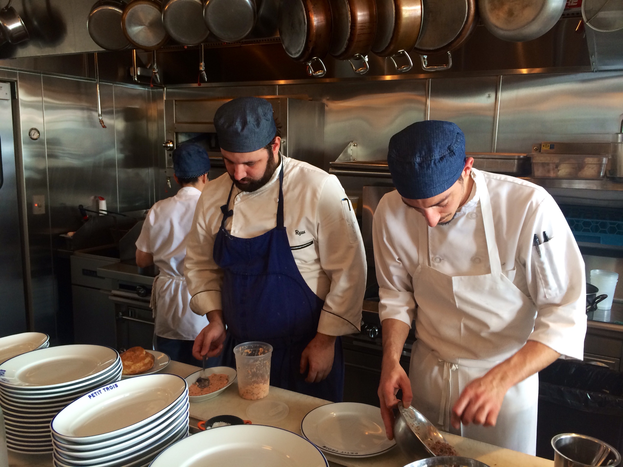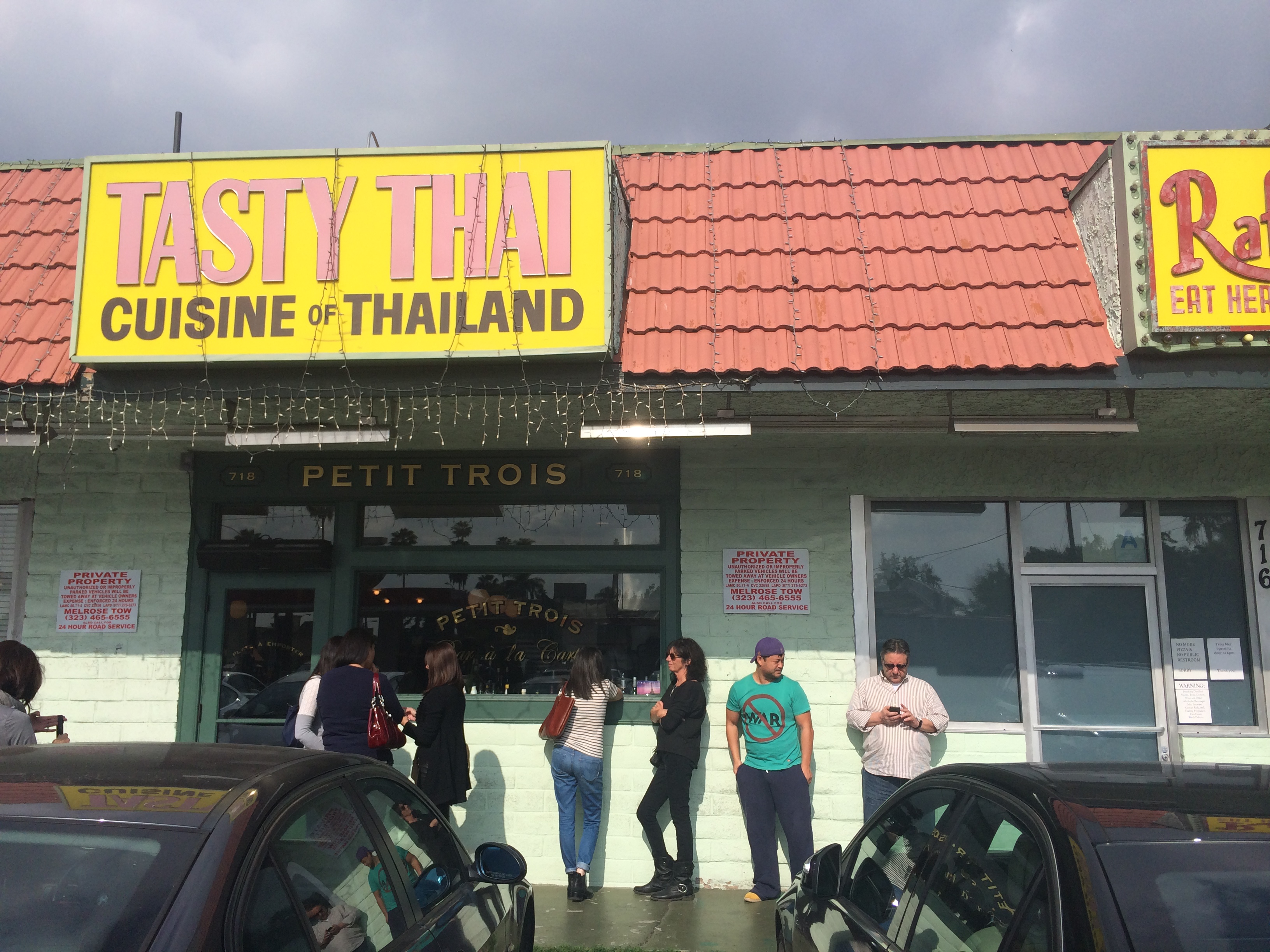 We hurried to a dumpy parking lot off Highland and Melrose around 11:30 to make sure we staked out a spot for the noon Saturday opening of Petit Trois since they don’t take reservations. Many other LA foodies obviously had the same idea. Right next to Chef Ludo’s many course ‘ticketed’ meal restaurant Trois Mec, the nondescript ghetto looking signage left over from the former establishments adds to the cool factor for me. Below “Tasty Thai” you can make out Petit Trois’s small letters. As we watch the numerous chefs prepare all their duties in unison, I feel like there is some artistic movement going on in there and wonder how long it takes them to get this rhythm of food preparation so smooth in such a tiny space for all eyes to see.