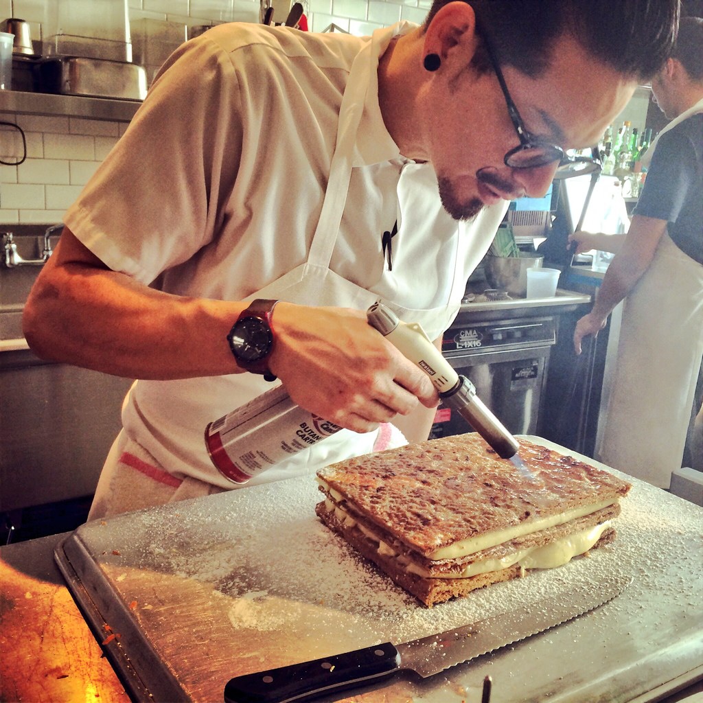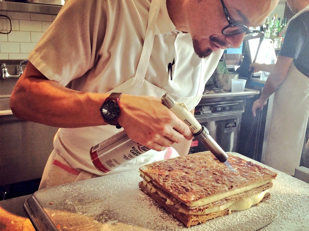 If this wasn’t enough to quench my carnal desires, I found room for dessert after I saw one of the chefs carefully craft a massive Napoleon, then cut all the edges off to make perfect rectangles. We watched as he layered the smooth vanilla cream on the pastry, sprinkled on powdered sugar, burnt the sugar to get a crispy caramelized top, and then disposed of all the ends that could have easily just gone right in my mouth. They make these exceptional French pastries in small batches so that the flaky puff pastry doesn’t get soggy.