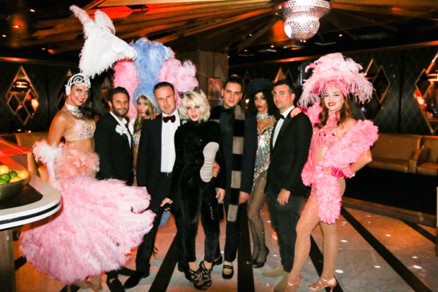 The h.wood Group’s Brian Toll, Markus Molinari & John Terzian with David Arquette, Bootsy Bellows girl, and burlesque dancers. (Photo credit: The h.wood Group)