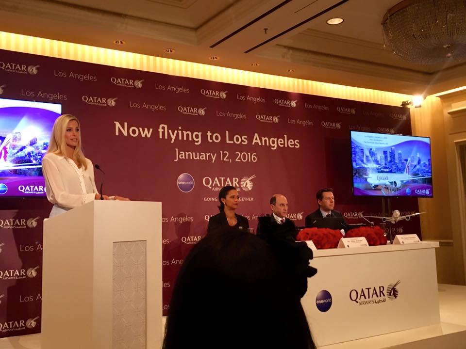 Group Chief Executive, His Excellency Mr. Akbar El Baker hosted a landmark press conference at The Peninsula Beverly Hills commemorating Qatar Airways long anticipated service to Los Angeles. The five star airline flies to 162 destinations with rapid growth occurring this year. Qatar Airways will expand globally to more than 220 destinations in the next 3 years.