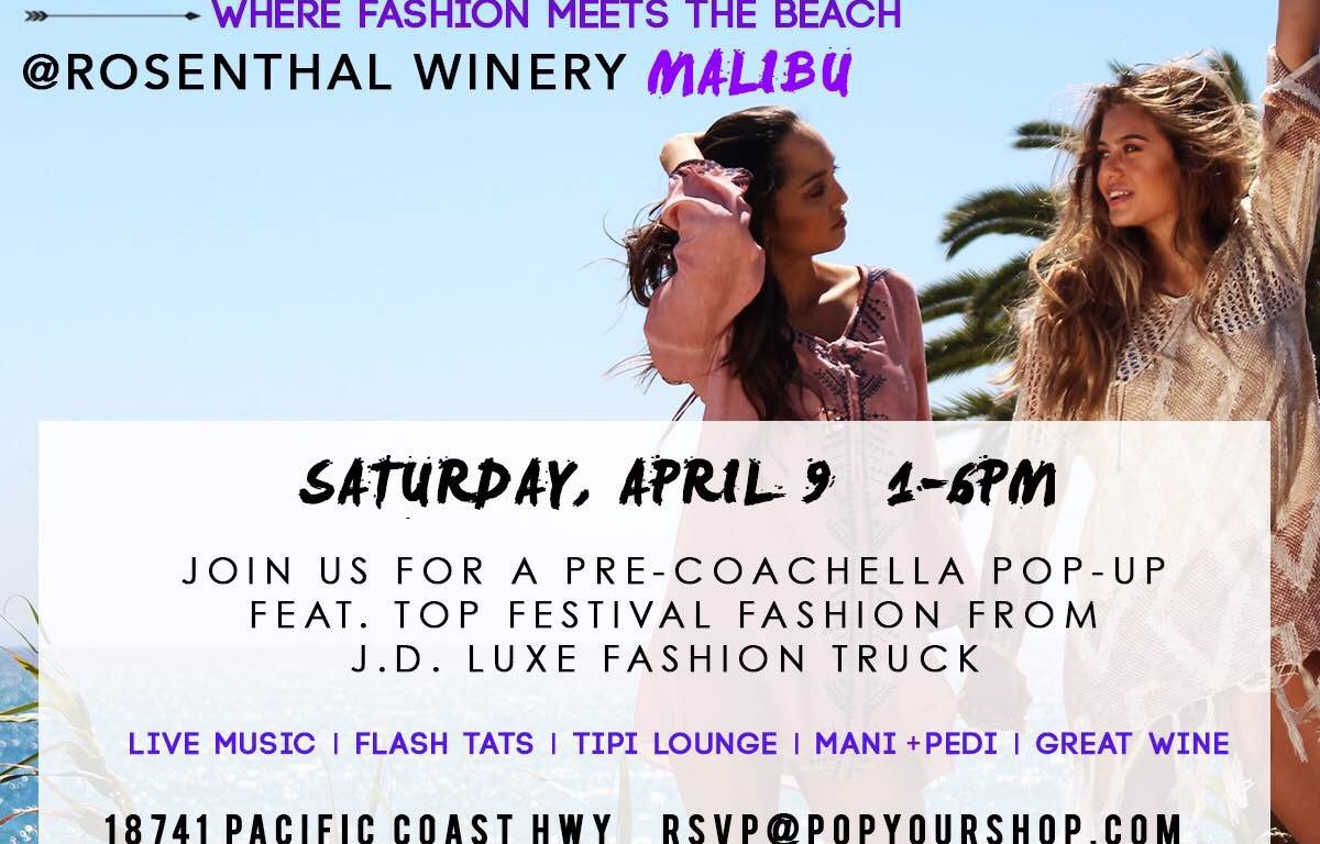 Pop Your Shop presents the 2nd annual ‘BUCHELLA’ event in Malibu on April 9th at Rosenthal Wines, and it’s going to be such a blast!! Sip a bottle of red and a bottle of white, hang out and chill, listen to some live tunes, and shop your heart out to prepare yourself for Coachella! Melissa and I did last year, and couldn’t get enough of the tiny bikinis and of course every single item in the JD Luxe Fashion Truck. We hope to see you there!