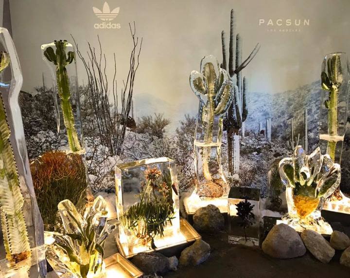 Chevrolet and PacSun hosted this rockstar party at a mansion in Rancho Mirage. Guests were shuttled from a location disclosed the day before to this private estate for food trucks, live music, cocktails, and fun. Chevrolet was onsite celebrating the launch of the all-electric Chevrolet Bolt EV. Guests could videotape themselves inside the car drumming on the steering wheel. Adidas had a walk-in freezer juice bar on site filled with cacti entombed with ice, where guests could pose and taste their new venture, Adidas healthy juices.