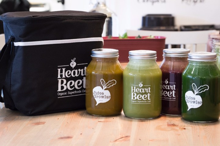 When I asked Monika Kinsman, proud owner of Heart Beet Superfoods Cafe (formally known as Thrive) and 3rd generation entrepreneur, what her concept was behind the cleanse she relayed, “The juice cleanse program started when I did a 10 day juice cleanse myself at home and experienced juicing firsthand… while the effects of the program were amazing, I added up all the “logistics” time and realized it was nearly 2 hours a day… from shopping for produce, to making the juice (that took the longest), to cleaning the juicer. Add on top of that the cost of the (mostly) organic ingredients… and wow, that was it. I decided my restaurant needed to offer the juice cleanse program. It’s hard enough to muster the motivation to do a cleanse and then STICK TO IT! So I figured if we can make the logistics of the juice cleanse EASY, it would make it easier for more people to be successful at doing it!”