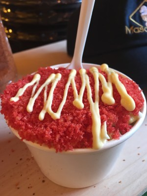 Mason’s Den was the most intriguing of the food stands. Everything on the menu was Instagram-worthy, and the unicorn elote could spark a cult following not unlike a Starbucks unicorn frappuccino. Walking up to the stand, your nose was filled with the sweet and savory scent of cooked corn. The unicorn elote was served on a stick, slathered in pink mayo, and sprinkled with rainbow colored crumbs. The hot Cheetos elote was conveniently served in a cup, drizzled with mayo and topped with hot Cheetos. The sweetness of both the mayo and the corn overpowered any spiciness of the Cheetos. The Cheetos served as an interesting texture, rather than a significant addition to the flavor profile. These dishes are certainly great for pictures!