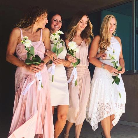 Instead of telling my girlfriends what to wear and dressing them all the same, I had several of my friends walk down the aisle together as a show of support. I told them to them wear whatever, with suggestions of “Malibu chic, white or pastel colors.” My friends looked beautiful and coordinated without ever having spoken about outfits.