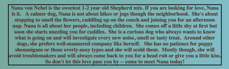 The rescue dedicates itself to rescuing German Shepherd from high kill shelters in California. In their 15 years of operation, they have saved over 12,000 German Shepherds and found them forever homes. When my husband and I purchased our first home, we were eager to rescue our first dog. Westside had an incredibly up to date Facebook page, and in the months leading up to our move in, I followed their postings religiously. Westside is dedicated to matching the right dog with the perfect home, and each posting gave a thorough description of each dog. Even if you aren’t considering rescuing a dog, the postings are so much fun to read! Not only are they descriptive, but they bring each dog to life through pictures and descriptions.
