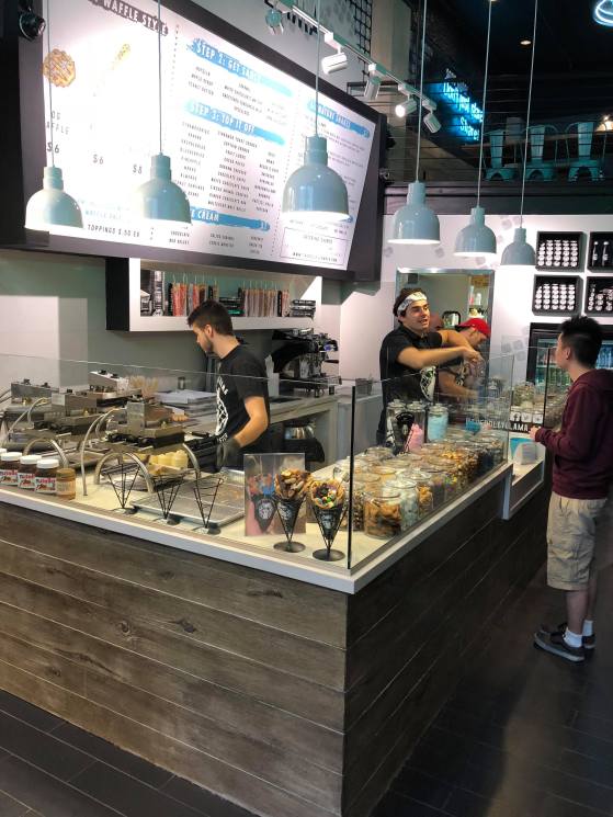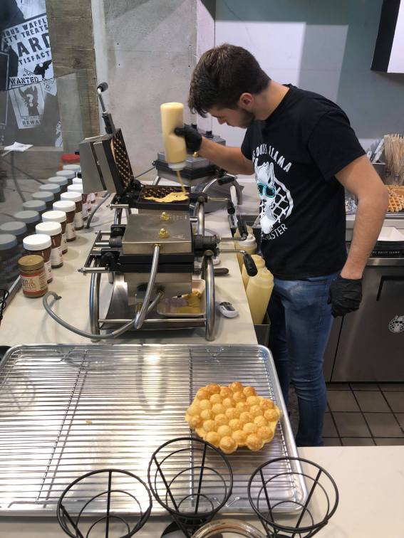 Upon entering the store, customers are greeted by the smell of fresh waffles and the sight of waffle irons and a toppings bar. Waffle enthusiasts can choose from their specialty bubble waffle, classic OG Belgian waffle, or instagrammable waffle stick. After selecting your waffle vessel, you choose one sauce and two toppings. The toppings choices are every five-year old’s dream come true! With over 10 syrups and 30 topping choices, the combination possibilities are endless! Toppings range from fresh fruit to sugary cereals, to candy bars and snacks. Ice cream is an additional $2 fee unless you chose the bubble waffle, then ice cream is included.