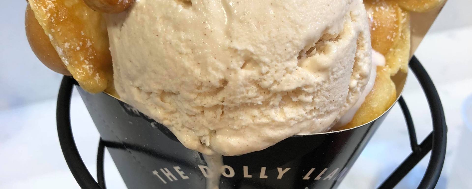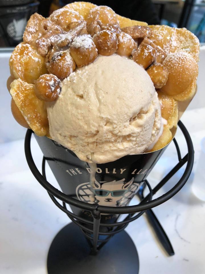 Dolly Llama is best known for their take on the bubble waffle. While the traditional Hong Kong style bubble waffle features light, air-filled bubbles, Dolly Llama puts a Belgian spin on theirs. Their pastry chef spent a year in Paris perfecting the Dolly Llama waffle batter. Their bubble waffle is an east/west hybrid of sorts. The waffle takes the form of a Hong Kong style bubble waffle but has the density and richness of a Belgian waffle.