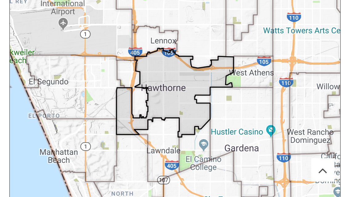 Hawthorne is just east of El Segundo and Manhattan Beach with the main arteries El Segundo Boulevard running east and west and Hawthorne and Crenshaw Boulevards north and south. If you’re lucky when coming into Hawthorne from the 105 freeway and Crenshaw exit, you can catch one of the private planes landing at the Hawthorne Airport. FUN!