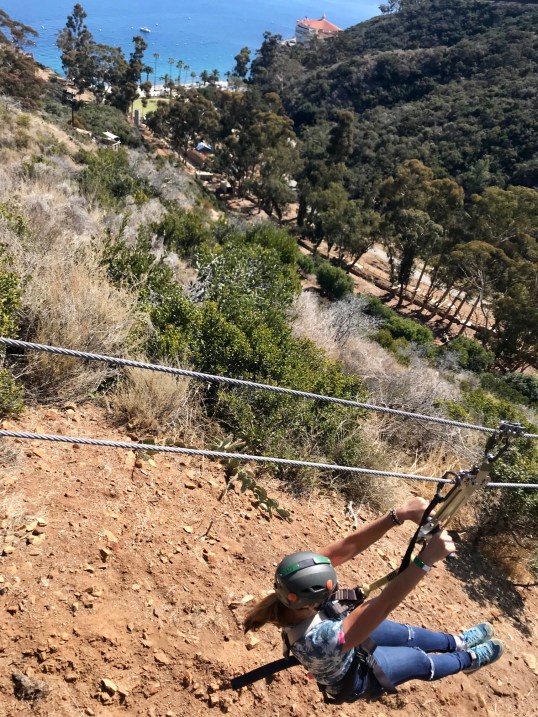 After zip lining in Costa Rica and burning through my glove and dangling with several miles down during the windiest day, and almost killing myself by crashing into a tree in Mazatlan, I was not super excited about zip lining in Catalina, especially after I saw the dinky lines above from Descanso Beach Club. The zip lines didn’t seem worthy enough. Boy, was I wrong! This two-hour adrenaline-fueled fun far exceeded my expectations. I am so glad I said YES! First, I am scared of heights and their new stopping mechanism makes it possible for anyone to zip line easily since the apparatus stops you before landing, so you don’t have to control the stopping before exiting.