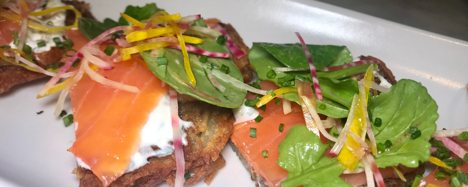 I expect the hand-carved rotisserie French Dip (with turkey or Prime Rib) to be the signature lunchtime dish (you know, that and three martinis). While the must-try appetizer, perfect for brunch, is smoked Norwegian salmon, served atop a potato hash brown, with creme fraiche and arugula. Enjoy it with a chilled glass of Champagne (and the delightful company of a brunch-loving food writer, if you really want the ideal pairing).
