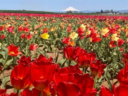 One of the final destinations on my Oregon Trail was about an hour north of Eugene. I passed numerous farms to find myself in Woodburn at the Wooden Shoe Tulip Farm where I pulled over to snap pics of the 40 acres of color waves. Snowy Mt. Hood was a surreal contrast in the background as I ran through the colorful tulip fields.
