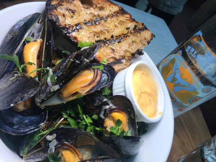 The Crab Rice was a winner with a generous portion of crab mixed with saffron, spring garlic, and basmati. The Black Cod had a crisp salty skin served with broccolini and butter beans. The Steak Frites with chimichurri sauce was a bit salty but still worthy of the price point. The chocolate mousse looked different than mousse I have sampled due to its lighter chocolate color, but was enough for two to share. The creamy mousse came doused with boozy cherries and peanut brittle.