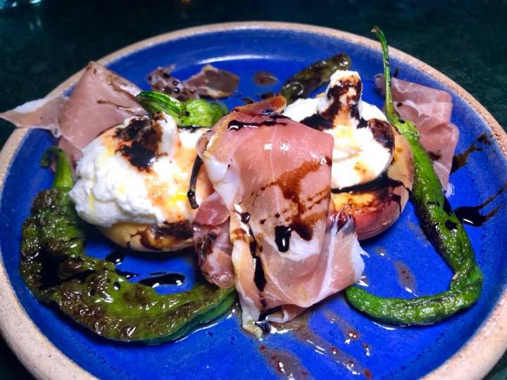Grilled Peach with burrata, prosciutto, and shishito peppers* – Always the perfect summer combination!