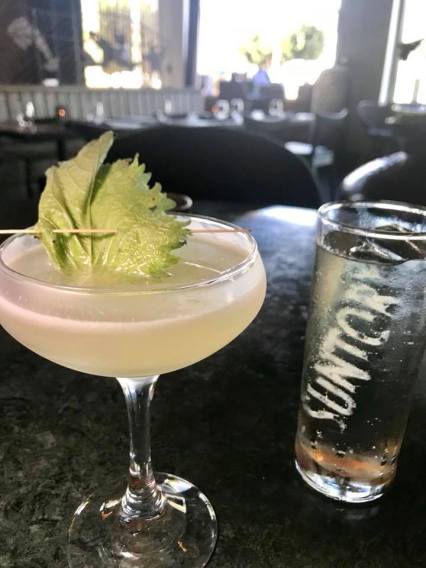 Far East Side (Sake, tequila, cucumber, lime, shiso) with Highball Cocktail, comprised of Suntory Whisky Toki and club soda with an etched Suntory ice cube.
