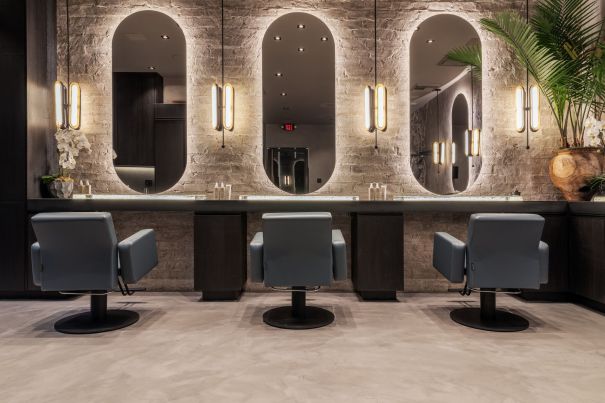 Beverly Hills 90210 welcomes a new hair salon to the world-famous zip code called TOTALEE on the Alley. Located behind a hidden private entrance in the back alley on Camden Drive, you’ll find a large metal door without any signage. You are then buzzed into a hallway lined with grey plaster and wooden strips inspired by layers of hair and bangs leading you to the salon door. Oversized iron with black glass panels welcomes you inside the uber private salon that sits only 4 chairs and a full floor to ceiling art installation featuring a famous French beauty.