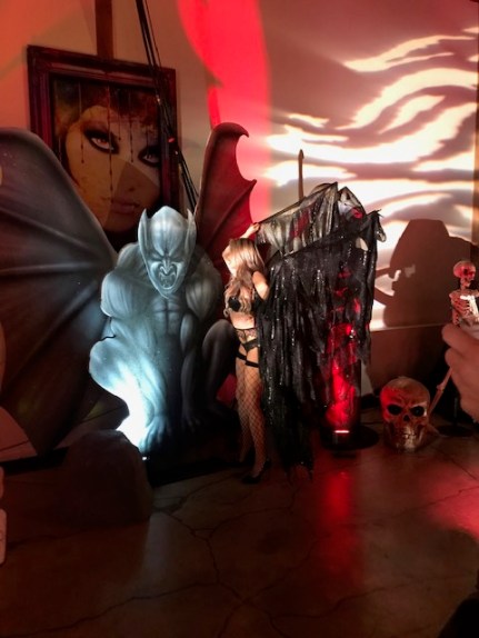 After securing VIP wristbands, we were whisked through ultra-tight security, into a whimsically spooktacular Halloween delight greeted by a daredevil clown on stilts, tinged-green little people, and step-and-repeat heaven! Hollywood’s top production and set designers imaginatively curated haunted themes across multiple vignettes and rooms galore. Dozens of costumed performers and skillfully trained scare actors trickled the event, adding to the overall experience. Open bar and light snacks were served in abundance. Each of the patrons’ costumes outdid the next, it felt as if one was amidst an unspoken costume contest!