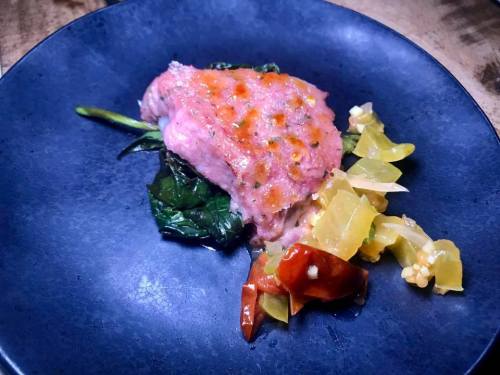 Our three-hour communal dining experience included six deliciously simple (but complex) dishes with a course of luscious bread that arrived with butter – sprinkled with black sea salt. The chefs discussed each plate before serving the local delicacies and surprises. The first course is what I call the “whet your whistle” course, the teaser to get your palette ready. The amuse-bouche consisted of a colorful bite on a toasted crisp dressed with chili lime yogurt, mini cucumber balls, caviar, and a mixture of herbs, nuts, and spices known as dukkah.
