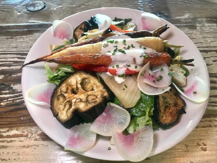 The grilled and chilled market vegetable salad looks like a bold-hued painting filled with herb roasted eggplant, baby carrots in all hues, charred red peppers and onions, marinated artichokes, watermelon radish, greens, and herb coconut yogurt. The veggies are so fresh. This bowl of healthiness feels like something you could eat every day and never get bored.