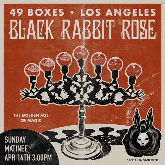 Put the magic in your own hands. The 49 Boxes will be doing 10 shows at Black Rabbit Rose beginning April 14 until May 26. Tickets are $89 each. The shows will run on Sundays at 3pm and 730pm. Anything is possible in Hollywood. Head on over to Dirty Laundry or No Vacancy to round your night out with another cocktail with speakeasy vintage style ambiance.
