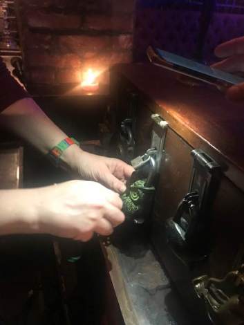 Ancient artifacts presented with clues helped us move and unlock one box to the next via card puzzles, science experiments involving fire and water, and problem-solving to determine codes to padlocks. A few surprises had me screaming with glee due to the unbelievable-ness of the event. This was the first time I participated in something like this, and the night turned out to be a blast! It’s like being at the Magic Castle, but you’re are in control of unveiling the magic, and soon enough, the magic of the boxes is revealed.