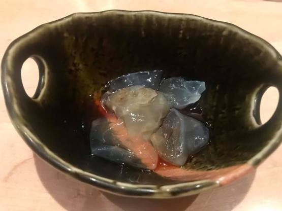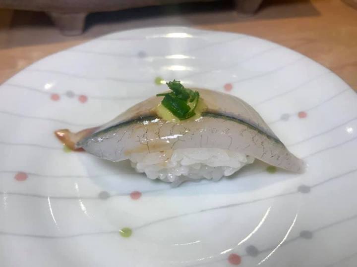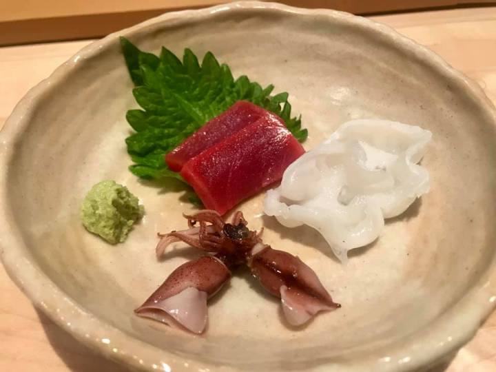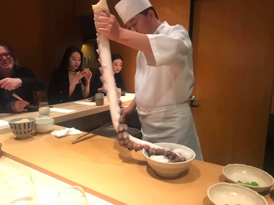 The multi-course menu features primarily nigiri sushi plus sashimi and handrolls, AND a lot of surprises! Adventurous sushi eaters will adore trying new dishes. Many firsts for me consisted of clear Japanese jellyfish in a bowl, monkfish liver in a little mound, needlefish, and holy live Japanese octopus! Not a small one like we’ve seen in Hawaii or Tulum, but one the chef lifted its arm with tentacles straight up to the ceiling that must have been the length of my body. We watched as he carefully sworded off the tentacles to reveal the several inch white squid.