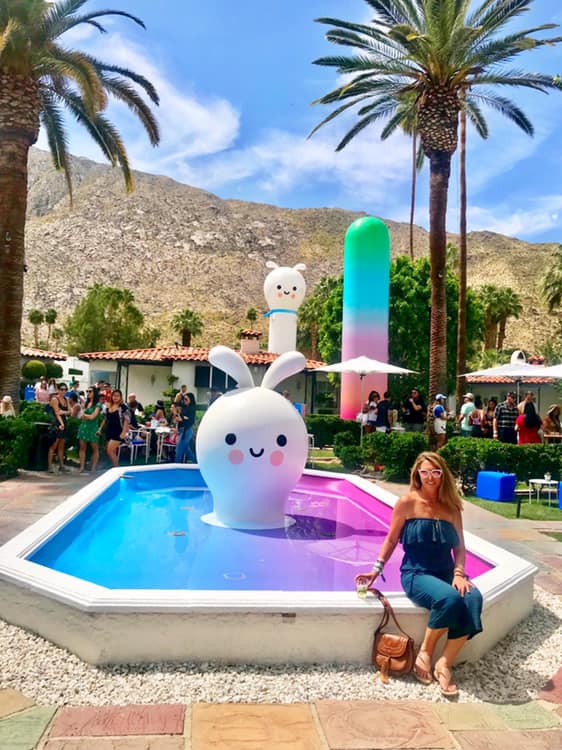 Off-site, the Amex Platinum party occurs all weekend and is always a pleasurable experience with stellar passed food bites by Chef Michael Solomonov, free-flowing bar, and live DJ sets. If you are an Amex Platinum member you can attend and bring 3 guests. This year the Amex Platinum party at the Avalon Hotel in Palm Springs created a colorful set up with blow up pastel-hued Pikachus as accents to the desert landscape. Each room or outdoor pool area offered a different perk/service – festival makeup looks by Milk Makeup, CBD massages, acupuncture, or cryo facials from Equinox’s EQX Body Lab, a bounce house, and even a light therapy room filled with a white AWAY luggage wall with video projections.