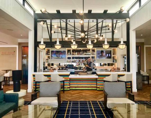Cheery fun beach decor exists at every turn with a colorful soothing ocean palette. The sweeping hallway is drenched in light and around every corner is another Instagrammable moment with green palm frond wallpaper, surfboard paintings in the elevator, and a folded almost 3D artwork that shows the sunset in one direction and the sunrise in the other, depending which way you walk.