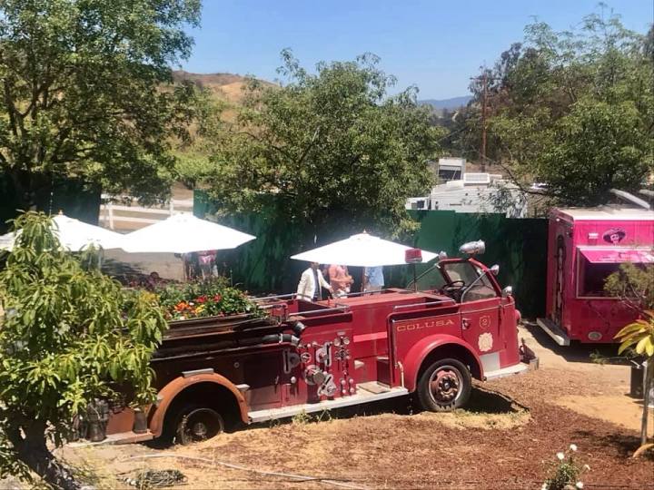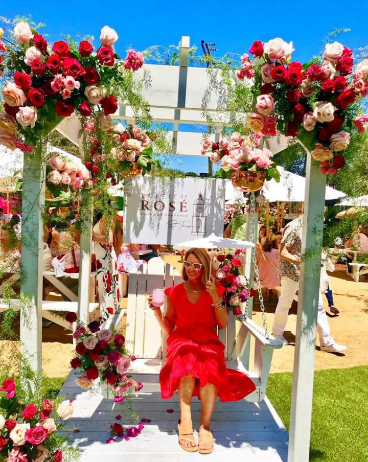 From noon to sunset (8 pm), guests enjoyed an elegant kick-off to summer. Beautiful people everywhere. Gorgeous, fun, and flirty outfits abound. Endless Instagram moments. Girls posing and boomerang-ing with the branded pink Rose Day LA sign. Girls posing in front of a vintage car draped in blush roses. Girls posing inside an old school VW bus. Girls posing near a vintage firetruck carved into the land spilling with flowers (perhaps left over from the fires). Girls posing in scenes that felt like St Tropez, on 2 seated bikes, and inside empty pink lifesize frames that framed the stunning landscape.