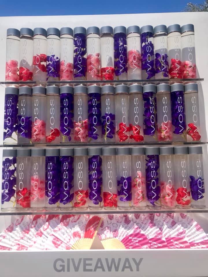 Guests indulged in various rosé day offerings inside their custom Rosé Day L.A. Corkcicle stemless drinkware. After our first round of G.H. Mumm Rose Champagne, we ordered bottles of Très Chic Rosé and Bertaud Belieu Initial Rose Wine that came with pink Rose Day Corkcicle stemless flutes. Other brands that guests could buy from $10 – $18 per glass or $40 – $120 per bottle included La Fête du Rosé and Bertaud Belieu Prestige Rose Wine (hosts of the annual Leonardo DiCaprio Foundation Gala in St. Tropez). Hydration included the beautiful sparkling flavored Voss water station also gifting white hats with ribbon to match their flavors.