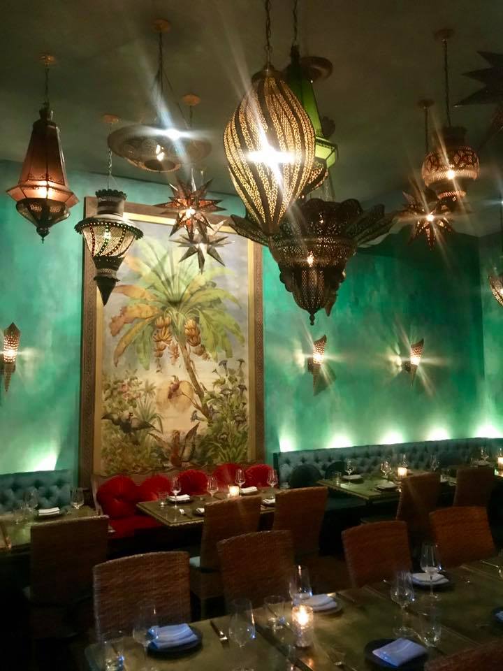 Through the white archways, the backroom can be peered in through the main dining room, which has an entirley different vibe, but immediately made me think of the perfect spot for a private group dinner where you won’t be bothered by other people. Turkish lamps in all gleaming colors and metals in shapes of stars and quadrilaterals hung from the ceiling illuminating the jewel-y green room. A central focus point was a floor to ceiling exotic art piece with lush palm trees and what looked like maybe raptors. The room was like “Rock the Casbah.”