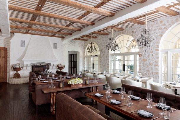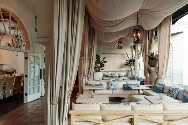 As our guests soon arrived, we were swept into a white booth surrounded by white tiles, white busts (Adonis, perhaps?), and white orchids. Above us were white ceiling beams and expressive white archways along the wall that one might find in Turkey. The rustic elegance in this main room came with a white Moorish-type fireplace hugged by chalices filled with white coral and shells.