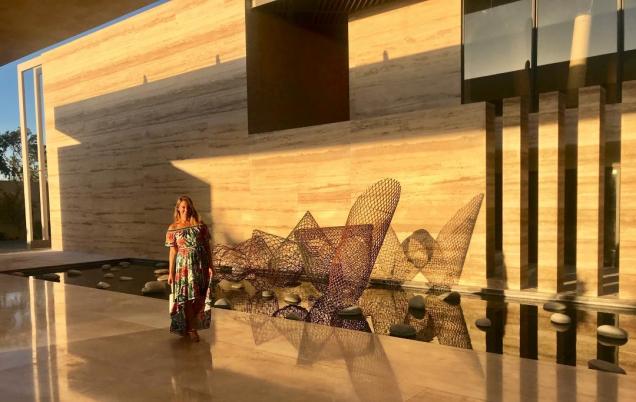 For a breathtaking getaway, consider staying at one of Cabo’s newest properties – the Solaz Resort, a stunning architectural gem that emerges from the stark desert landscape designed in harmony with its seaside location. Perched on 34 acres overlooking the Sea of Cortez, luxurious Solaz Resort was built to blend with the environment. From the open ocean view lobby with driftwood furniture, 400-year old cacti, and water arteries on the floor, find your path to the sea through enchanting desert gardens with native trees, bushes, and flowers infused with nature’s flitting butterflies and birds. As you move throughout the beach retreat covered in ocean blue marble (known as Mexican marble), the angles and lines of the buildings and even the cacti placement cast mesmerizing shadows from sunrise to sunset. From my breakfast view above the gallery rooms, the flat roofs covered with endemic plants and a few lone artistic looking cacti blend with the natural world.