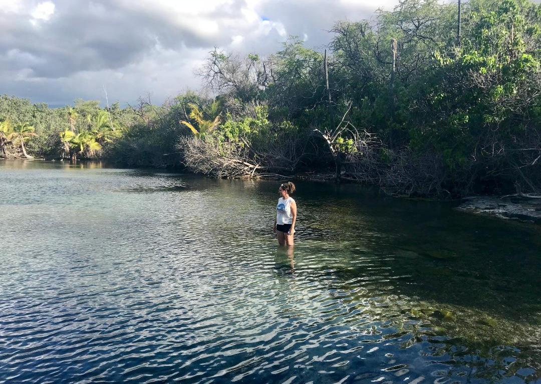 First, we accessed a dirt road between mile marker 82 and 83 and drove about a mile to park at a small lot near the shore via a very bumpy road. Once you walk in towards the rugged black pebbly beach with turquoise water, head north or right along the beach. This is more of a walking beach than a swimming beach since the water is rough. Wear durable closed-toe shoes over the sharp rock and pebble beach. You will see several hidden pools or lava caves that look like cenotes or sinkholes between rocks and turtles actually camouflage with the rocks on the beach, so be careful not to step on these beauties.