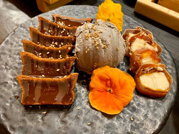 Find room for the chewy Mochi Cake with Black Sesame Ice Cream.