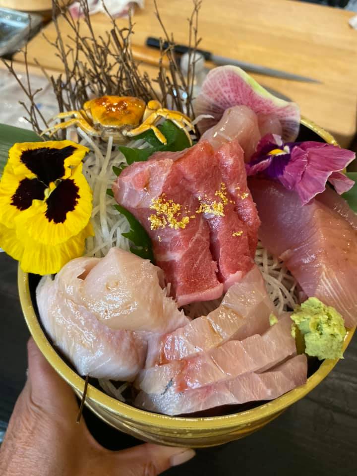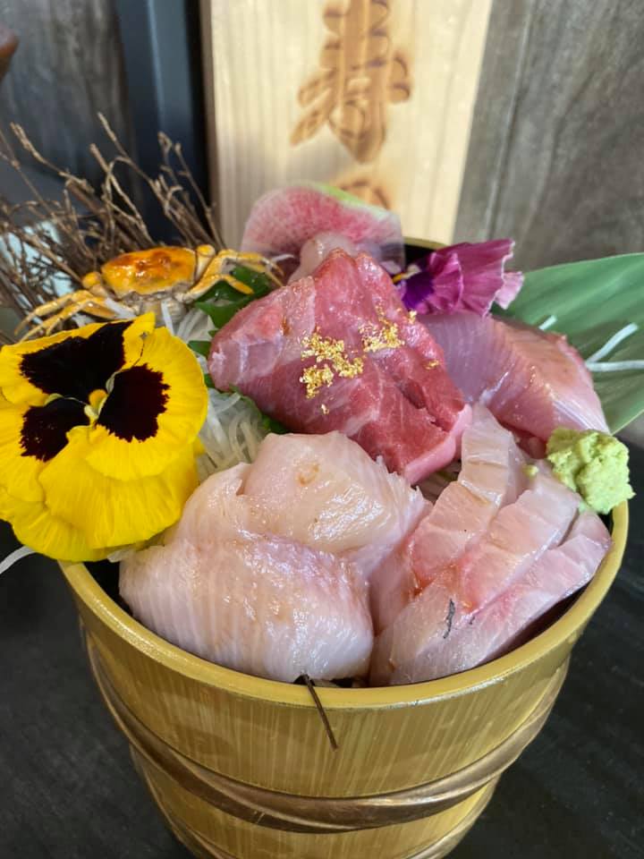 Other standouts include the Pork Belly, Charcoal Grilled Whole Octopus, and assorted thick-sliced Sashimi Omakase artistically presented in a bucket with a sprinkle of edible gold.