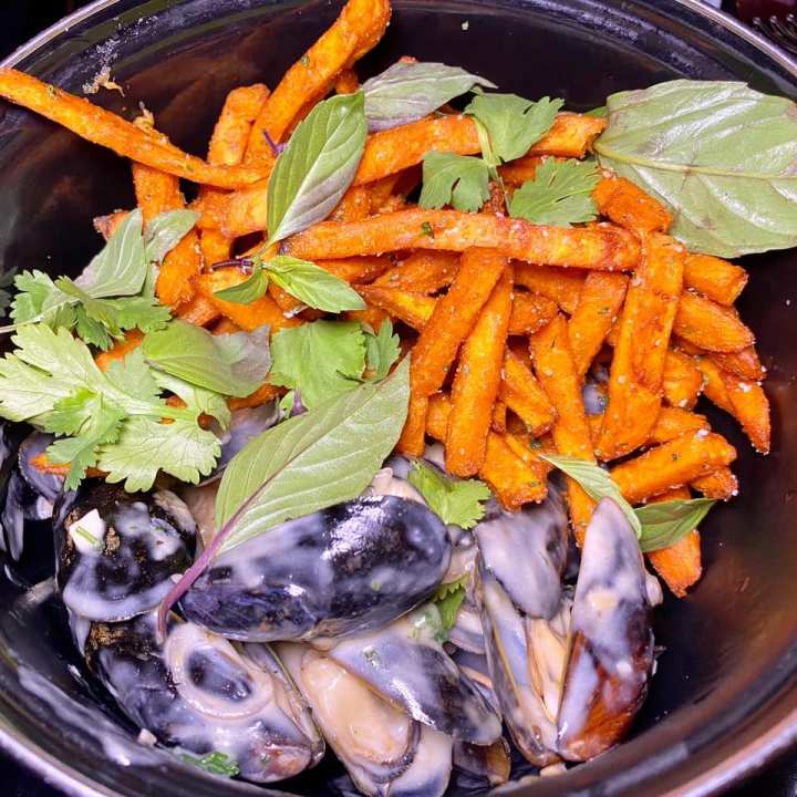 Slide into creamy flavor-bursting Mussels prepared in a new way! The coconut lemongrass ginger mussel broth mixture is rich and so right – hard to leave a drop behind. If it wasn’t rude, I would lick my fingers. Instead of garlic fries, the mussels come with sweet potato fries, a surprising California take on a Moules Frites.