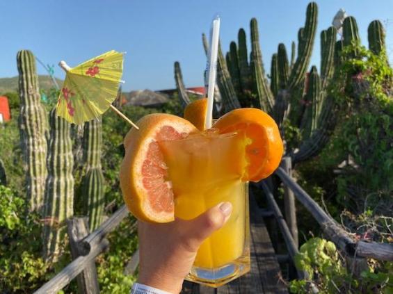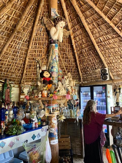 A few people were already inside enjoying drinks at the circular bar with a rooftop area of artwork. In the distance, I could smell the ocean air and since this landscape is cacti-studded I could see clear to the sea. An older man with long grey beard let my husband and me in while we eagerly stared wide-eyed at the size of the drinks being made in the circular palapa bar area.