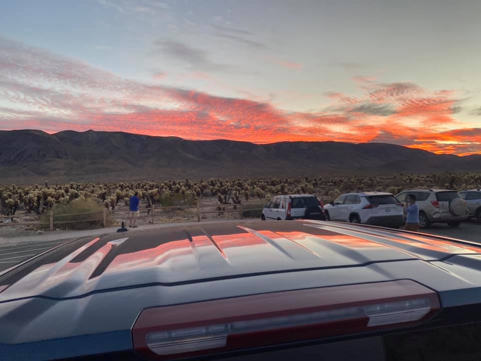 From our parked car in the Cholla Cactus Garden we screamed in delight as the sunset created a dizzying array of color in all directions while we enjoyed the comfort of being outside in the dramatic desert landscape but toasty warm under the blankets in the back of the truck. The clouds streamed pink then deep red and swirly blacks then shifted into a brilliant blue-sky glow before the stars presented themselves one by one.