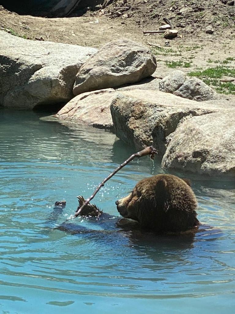 We watched a bear play with sticks, swim around, and wobble over to bear friends. The bear even threw dirt on the other bear from above to wake him/her. Other creatures that fascinated us included the arctic fox, tall marsh birds with red beaks making trumpeting noises, a snow leopard, and more.