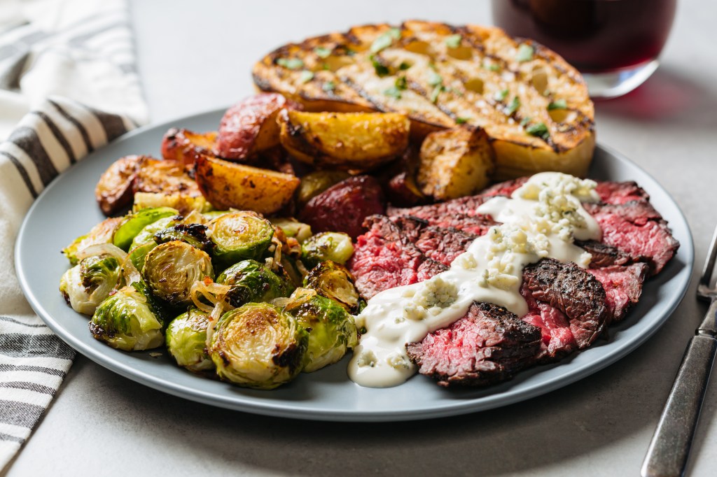 - Blue Cheese Grass-Fed Steak Plate: grilled signature grass-fed steak, medium rare, topped with housemade blue cheese sauce;