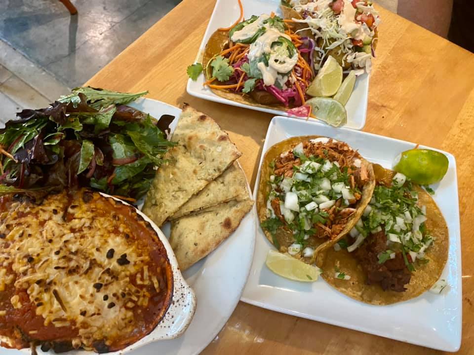 Vegans can rejoice with an extensive plant-based menu. Try the Seven Layer Dip with ‘follow your heart’ mozzarella and cashew nacho cheese plus bean paste. Slide into your next course with some rich Baked Eggplant Farmesan with flatbread and an assortment of vegan tacos like spicy eggplant barbacoa, ban mi made with fried tofu, Baja avocado, and street tacos with seasoned jackfruit carnitas. New menu items include Spicy Mexican Pizza, Seasonal Green Lemongrass Pasta, and Tomato Bisque.