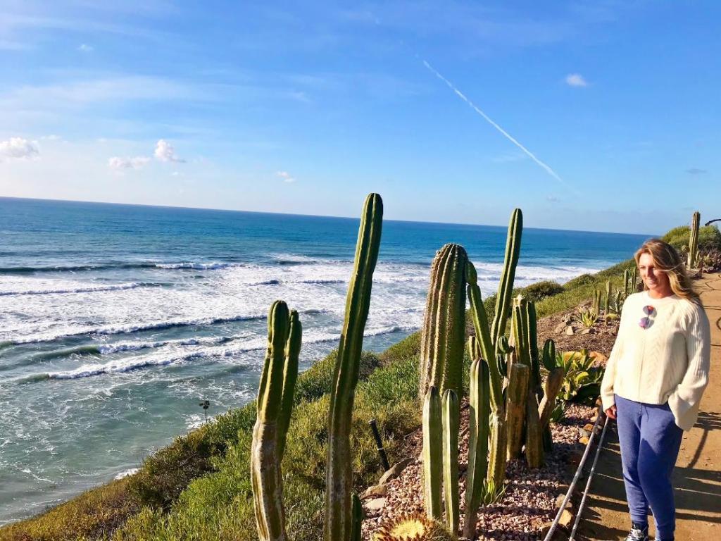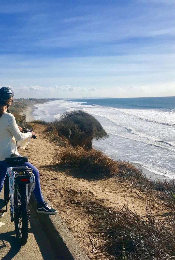 We flew with a few easy pedals careening through quiet seaside neighborhoods admiring homes decorated for Christmas, hopping off at various beach stops and the Self-Realization Fellowship Encinitas Shrine. The free lake shrine meditation garden and temple hang off the ocean cliff with spectacular views of the Pacific Ocean til the end of the world. After zooming back up the coast around 20 mph pedaling like you would on a regular bike with the winds whipping against us, we marveled at the massive stretches of pristine coastline and didn’t have to worry about getting tired or climbing hills or even running out of a charge since the Pedego Electric Bikes use a rechargeable lithium-ion battery that lasts all day.