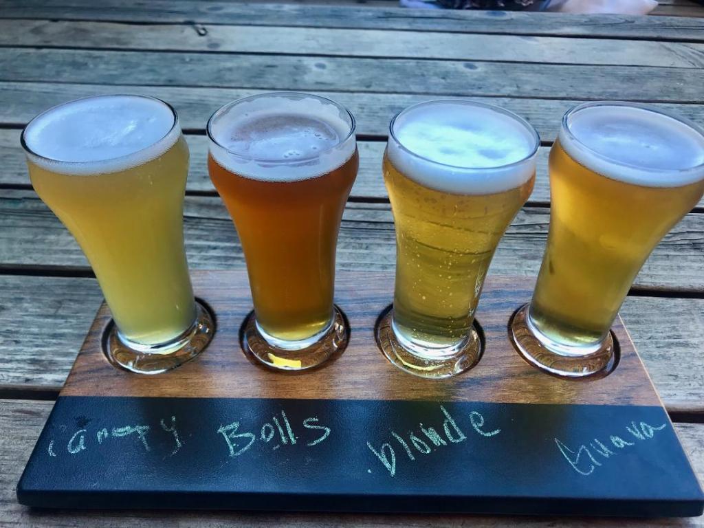 Sunday Funday included a stop at Carlsbad’s new multi-level community dining plaza-style complex called Park 101 in the heart of the Village. By noon $15 beer flights (4 beers) appeared on wooden boards with the name of each draft written on small chalkboards below each 6-ounce brew. Outside on high-top communal tables, we noshed on BBQ lunch in the sun. We weren’t afraid to sample the Park 101 Combo with tri-tip, brisket, pulled pork, seared ahi, and St. Louis ribs along with sides of eggs, baked beans, pickles, brussels sprouts, and seasoned breakfast potatoes.